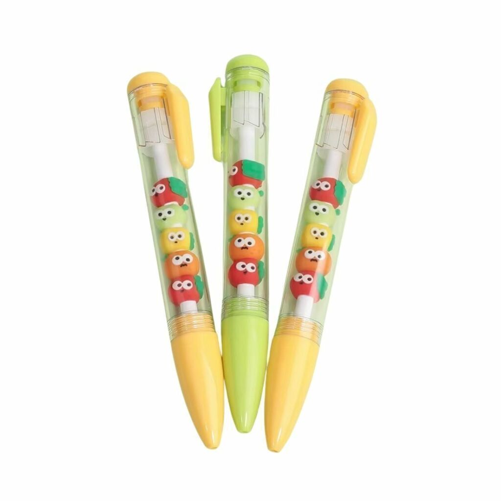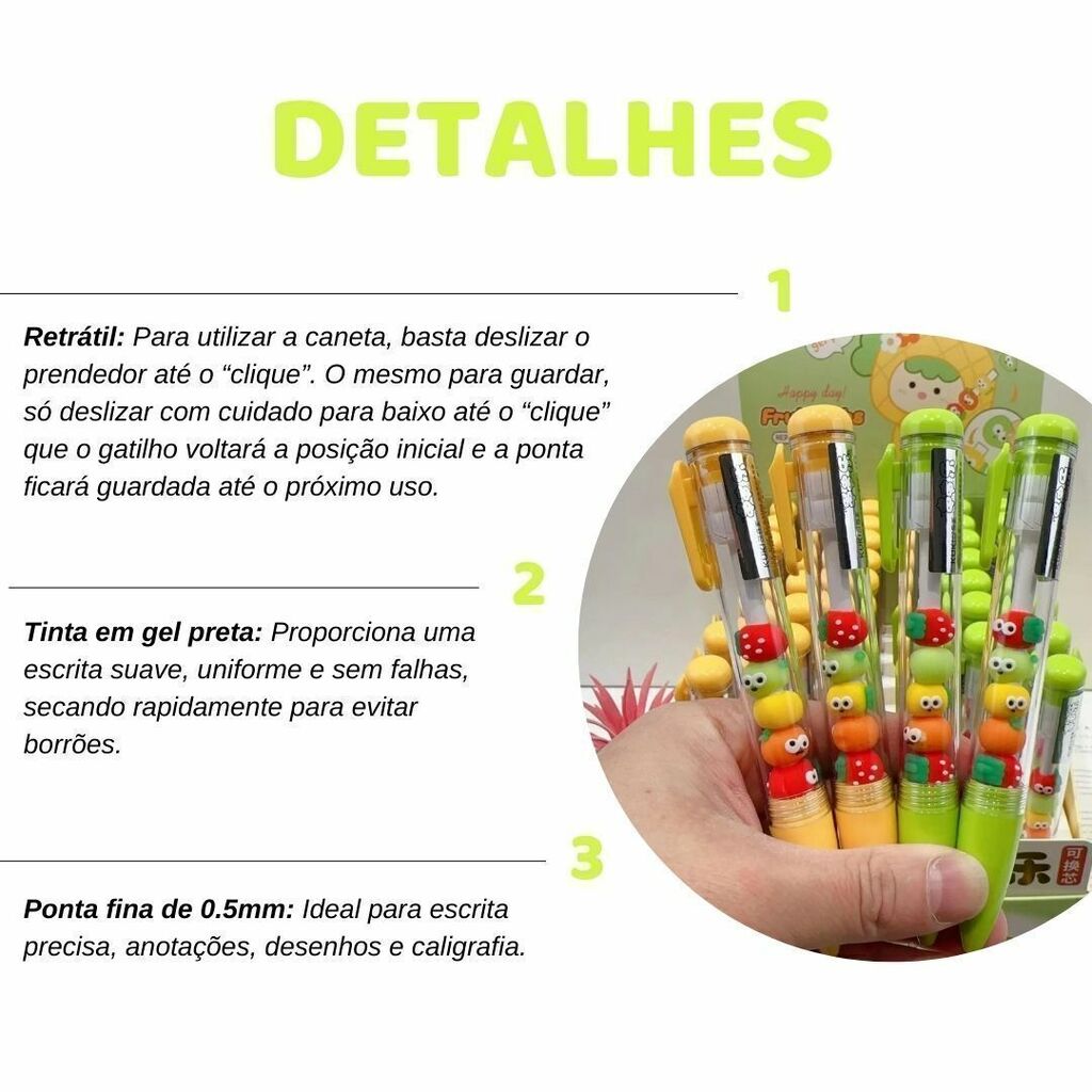 - Embalagem: 1 (uma) caneta escolar retrátil frutas divertidas ponta fina 0.5mm tinta gel preta.